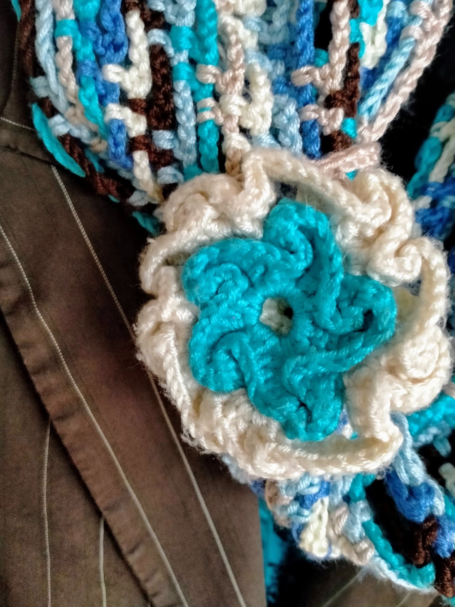 Stiekem was ik nooit helemaal tevreden met mijn sjaal. De duinrozen waren wat te zwaar en trokken altijd naar het laagste punt. Terwijl ik de rozen juist halverwege mijn hals gepland had. Dus liep ik de hele dag aan mijn sjaal te hijsen. Ook bleef hij altijd een beetje dunnig. Echt warmte gaf hij niet. En op mijn werk vind ik een warme sjaal onmisbaar. Ik loop regelmatig op mijn werk met paarse handen van de kou. Ik trek gerust halverwege mijn jas van de kapstok en wandel met jas en al door de gangen en in de lokalen. De kinderen kijken er niet eens meer van op. Wel toen ik laatst met vingerloze handschoenen binnen kwam. Maar dat is in deze corona periode niet zo hygienisch. Een dikke sjaal is handiger. Ik draag veel bruin/blauwe kleurcombinaties. Maar een bruin, blauwe dikke sjaal had ik niet echt. Alleen dat dunnetje. Dus besloot ik afgelopen week dat daar verandering in moest komen. Ik trok dezelfde wollebolletjesbak te voorschijn. Want het hoort nog steeds tot mijn favoriete garen. Vooral om leuke decoraties mee te haken. Het blijft kleurvast hoe lang het ook in de zon hangt. Maar nu dwaal ik weer af. Ik was gebleven bij de bak garen die ik onder de kerstboom neerzette. Vlak naast mijn okergele stoeltje. En waar ik elke keer weer in dook om dezelfde kleurtjes te voorschijn te halen als ik jaren geleden gebruikte. Donkerbruin was echt nog een heel klein restje. De nieuwe kleur donkerbruin die ik had was lichter. Bij de laatste toer donkerbruin moest ik de begin en einddraad letterlijk aan elkaar knopen. Ik kon ze niet meer stevig onzichtbaar weg stoppen. Ondertussen haalde ik de duinrozen juist weer van mijn sjaal. Een uitdaging want meestal maak ik iets vast met de bedoeling dat het nooit meer los komt. Een van de rozen maakte ik vast op een lossen ketting. Die roos mocht dienst doen als versiering. Gisteren haakte ik dan toch eindelijk de laatste toer. Tenminste. Voor nu even. De sjaal is heerlijk warm. Maar wie weet kriebelt het binnenkort toch weer. Of begin ik met een andere kleurencombinatie. Ik zag heel veel leuke kleurtjes groen. Gecombineerd met zwart lijkt me dat erg leuk... Of zal ik dan ook een ander patroon uit zoeken? Er staan er genoeg op Mooglyblog. Nou ja ik houd jullie wel op de hoogte. ;-)
